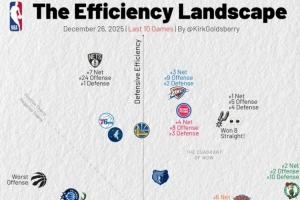 體育資訊12月27日訊 今天,美媒Kirk Goldsberry曬圖統(tǒng)計(jì)了NBA過去10場比賽所有球隊(duì)的攻防效率,詳情入下: