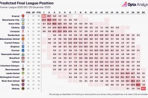 體育資訊12月27日訊 在Opta超算最新的英超奪冠預測中,阿森納概率下降,目前以68.5%領跑,曼城24.6%第二,維拉5.7%第三,利物浦0.8%第四,切爾西0.4%第五。