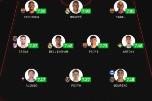 體育資訊12月27日訊 Sofascore評(píng)出了2025年西甲最佳陣容,姆巴佩、拉菲尼亞、亞馬爾組成三叉戟。