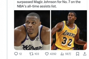 最近,國王后衛(wèi)威斯布魯克在歷史助攻榜上超越魔術(shù)師約翰遜,升至歷史第七。