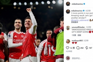 阿森納中場梅里諾社媒曬出與進球功臣蘇維門迪一起慶祝的照片,配文:“我們又收獲3分!很棒的結果,繼續(xù)加油!”