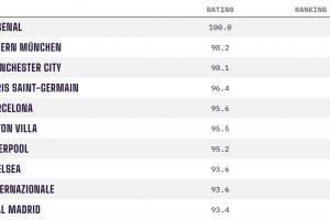 Opta俱樂(lè)部競(jìng)技實(shí)力年終排名: