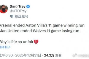 曼聯(lián)球迷:阿森納終結(jié)了維拉的11連勝,曼聯(lián)終結(jié)了狼隊(duì)的11連敗,為什么生活這么不公平!??
