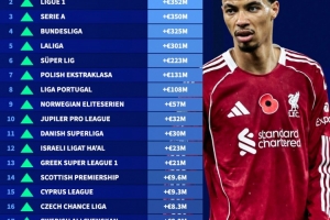 體育資訊12月31日訊 德轉(zhuǎn)統(tǒng)計了2025年歐洲聯(lián)賽整體的身價上漲和跌幅排行榜,英超斷層領先排名榜首。