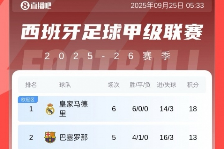 體育資訊09月25日訊 西甲3場(chǎng)比賽戰(zhàn)罷,馬競(jìng)3-2絕殺巴列卡諾,皇家社會(huì)1-0馬洛卡,赫塔菲1-1阿拉維斯,最新積分榜如下:
