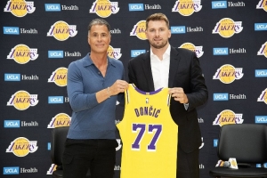 但與大多數(shù)的開始不同,這一次算是一次預(yù)演,二月份加盟湖人讓東契奇感受到了在洛杉磯的生活會是什么樣子。在他被獨行俠交易之后、為新球隊首秀之前,湖人讓他來到中場,像歐洲足球運動員與新俱樂部的支持者見面一樣,向球迷們介紹他。他在洛杉磯的第一場正式比賽是一件大事,球館里的每個座位上都放著77號的金色湖人球衣(而且詹姆斯在賽前熱身時也穿著)。