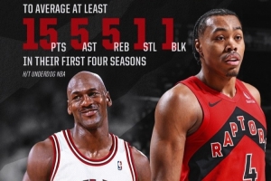 生涯前四季,斯科蒂-巴恩斯場(chǎng)均17.2分7.5籃板5助攻1.2搶斷1蓋帽;喬丹前四季場(chǎng)均32.7分5.6籃板5.3助攻2.8搶斷1.3蓋帽。