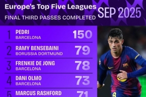 體育資訊10月1日訊 巴薩在9月份的6場(chǎng)比賽中,取得5勝1平。其中巴薩中場(chǎng)佩德里功不可沒(méi),他被喻為哈維和伊涅斯塔的結(jié)合體。據(jù)Squawka數(shù)據(jù)統(tǒng)計(jì),在9月份歐洲五大聯(lián)賽進(jìn)攻三區(qū)成功傳球次數(shù)榜單中,佩德里以150次斷崖領(lǐng)先。