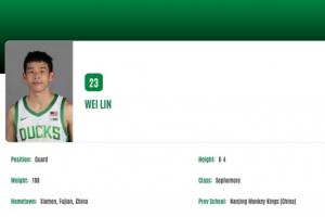 俄勒岡大學(xué)男籃官網(wǎng)已經(jīng)上線林葳個(gè)人信息,身高6英尺4英寸(約1米93),體重190磅(約86公斤),年級(jí)一欄標(biāo)注是大二。