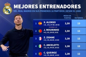 體育資訊10月10日訊 德國轉(zhuǎn)會市場統(tǒng)計了2000年以來皇馬主帥前16場比賽的勝利場次,并列出榜單,阿隆索13勝居首,穆里尼奧、齊達內(nèi)、安切洛蒂12勝。