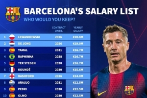 體育資訊10月10日訊 德國轉(zhuǎn)會市場列出了巴薩球員年薪排名,萊萬2080萬歐居首,德容1900萬歐次席。