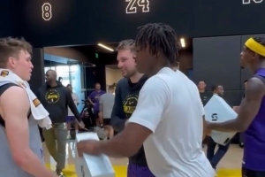 體育資訊10月11日訊 今日,湖人官方Instagram曬出一段昨日東契奇在訓(xùn)練后向全隊(duì)贈(zèng)送自己的簽名球鞋的花絮視頻。
