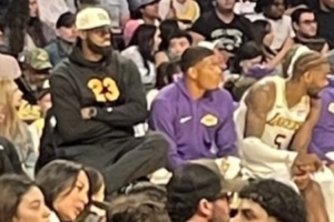 據(jù)洛杉磯記者M(jìn)ark Medina報(bào)道,本場(chǎng)比賽詹姆斯來(lái)到了現(xiàn)場(chǎng)觀(guān)戰(zhàn),他坐在隊(duì)友旁邊的一張高椅子上,大概是為了緩解坐骨神經(jīng)痛。