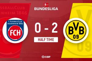 上半場補(bǔ)時6分鐘,海登海姆0-2多特。