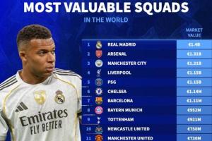 體育資訊10月20日訊 德轉(zhuǎn)統(tǒng)計(jì)了最新的俱樂(lè)部身價(jià)榜,其中,皇馬以14億歐高居榜首,阿森納、曼城分列二、三,共7支球隊(duì)突破10億歐。