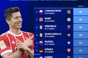 體育資訊9月14日訊 德國轉(zhuǎn)會(huì)市場統(tǒng)計(jì)了本世紀(jì)五大聯(lián)賽球員對(duì)陣?yán)蠔|家的進(jìn)球數(shù)量,并列出榜單,萊萬對(duì)陣多特打進(jìn)29球居首,凱恩對(duì)陣萊斯特城攻入19球次席。