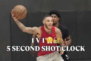訓練師曬騎士后衛(wèi)朗佐-鮑爾、開拓者后衛(wèi)斯庫特-亨德森,以及另一位職業(yè)球員Milan Acquaah的單挑訓練視頻,進攻時間限時5秒。