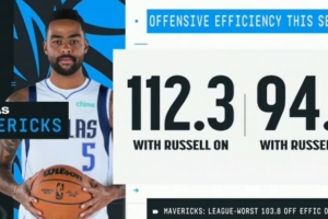 拉塞爾在場時獨行俠進攻效率112.3,下場后為94.7;目前獨行俠進攻效率103.8聯(lián)盟墊底