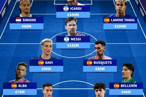 體育資訊10月29日訊 德國轉會市場根據(jù)巴薩青訓出身現(xiàn)役球員的歷史最高身價,列出身價最高陣容,梅西領銜,亞馬爾、伊卡爾迪、哈維-西蒙斯、奧納納在列。