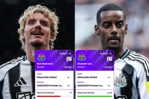 伊薩克上賽季:場均射門2.5次、射正1.5次,近0.8球;射門-進球轉(zhuǎn)化率30.26%,傳球16.5次,成功率77.05%;快速做球1.6次,造犯規(guī)0.5次,成功爭頂0.9次,地面成功對抗2.2次,奪回球權(quán)1.8次。