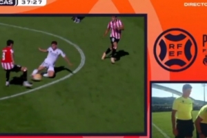 阿韋洛亞率領(lǐng)的卡斯蒂亞在對陣畢巴B隊的比賽中也遭遇了類似的爭議。比賽第36分鐘,由于塞斯特羅累計兩張黃牌被罰下,卡斯蒂亞不得不以10人應(yīng)戰(zhàn)。這張紅牌同樣充滿了爭議??ㄋ沟賮喺埱蟛榭碫AR,主裁判大衛(wèi)-洛佩斯也確實回看了這一動作。然而,皇馬替補席不敢相信眼前發(fā)生的一切,球員本人也搖頭否認(rèn),堅稱自己只是碰到了球。