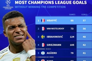 體育資訊9月17日訊 德國(guó)轉(zhuǎn)會(huì)市場(chǎng)統(tǒng)計(jì)了沒(méi)有贏得歐冠球員的歐冠進(jìn)球數(shù)量,并列出榜單,姆巴佩57球居首。