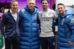 巴西隊(duì)在阿森納基地進(jìn)行訓(xùn)練,安切洛蒂訓(xùn)練之前與阿爾特塔合影,巴西隊(duì)社媒曬出照片。