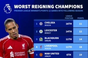 體育資訊11月24日訊 利物浦在本輪英超焦點(diǎn)戰(zhàn)主場0-3完敗諾丁漢森林,12輪聯(lián)賽后僅積18分,《轉(zhuǎn)會市場》統(tǒng)計顯示他們也是同期戰(zhàn)績第4差的英超衛(wèi)冕冠軍。