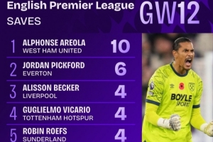 與此同時(shí),西漢姆門將阿雷奧拉則單場(chǎng)完成10次撲救,幫助西漢姆戰(zhàn)平伯恩茅斯。這也創(chuàng)下了本賽季英超門將的單場(chǎng)撲救紀(jì)錄。