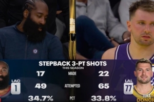現(xiàn)場轉(zhuǎn)播方曬出本賽季后撤步三分統(tǒng)計:哈登49投17中,命中率34.7%;東契奇65投22中,命中率33.8%。