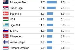 U21球員出場時間占比17.7%的澳超聯(lián)賽,在本次排名中位居首位。塞爾維亞超級聯(lián)賽(15.8%)和丹麥超級聯(lián)賽(11.7%)緊隨其后,排名二三位。