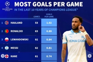 體育資訊11月26日訊 馬賽在本輪歐冠2-1逆轉紐卡斯爾,奧巴梅揚梅開二度?!掇D會市場》統(tǒng)計顯示,他也是近10年歐冠場均進球榜前十。