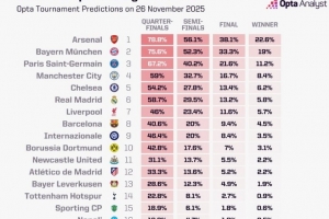 OPTA更新歐冠奪冠概率:阿森納22.6%居首,拜仁次席,巴黎第三