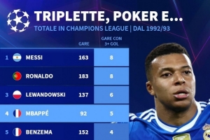 體育資訊11月27日訊 德國轉會市場統(tǒng)計了1992-1993賽季歐冠改制以來球員單場進球3+的場次,并列出榜單,梅西、C羅8場居首,萊萬6場、姆巴佩5場。