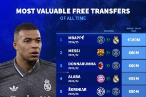 自由轉(zhuǎn)會球員德轉(zhuǎn)身價榜:姆巴佩1.8億歐居首,梅西8000萬歐次席