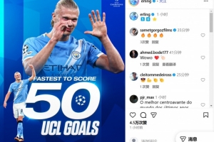 在社交媒體上,哈蘭德曬出了自己最快達(dá)成歐冠50球的海報,顯然這樣的成就令曼城射手非常自豪。