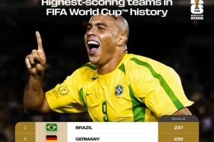 榜單上,巴西237球居首,德國232球緊隨其后,巴德斷檔前二,阿根廷152球第3,法國136球第4,意大利128球第5,西班牙、英格蘭、荷蘭、烏拉圭、匈牙利前10。