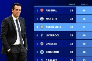 2025年英超積分榜:阿森納68分居首,曼城65分次席,維拉第三