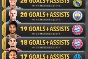 本賽季五大聯(lián)賽球員參與進(jìn)球榜(所有賽事):