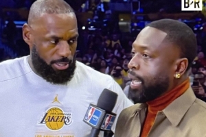 體育資訊12月2日訊 在上周六湖人對陣獨(dú)行俠的比賽中,韋德現(xiàn)身場邊采訪詹姆斯。
