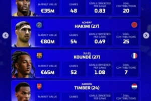 阿什拉夫(巴黎,27歲,摩洛哥):身價(jià)8000萬(wàn)歐,54場(chǎng),場(chǎng)均0.69丟球,直接參與25球