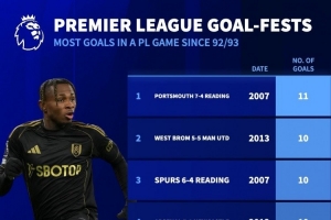 體育資訊12月3日訊 英超第14輪比賽,曼城客場5-4擊敗富勒姆。德國轉(zhuǎn)會(huì)市場指出,英超歷史上只有6場比賽的進(jìn)球數(shù)量多于此役。