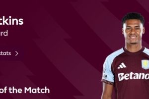 本場比賽沃特金斯梅開二度,成為球隊逆轉(zhuǎn)最大功臣,賽后他也當選英超官方球迷票選全場最佳球員。