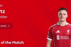 此役維爾茨踢滿全場,并造穆基勒烏龍,為利物浦扳平比分,英超官方宣布,經(jīng)過球迷的投票,維爾茨當選本場比賽最佳球員。