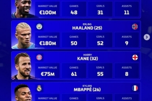 姆巴佩(皇馬,26歲,法國(guó)):身價(jià)1.8億歐,63場(chǎng),62球,10助攻