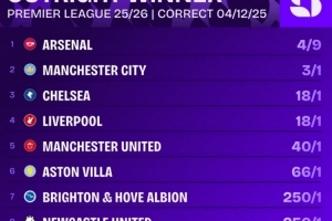 體育資訊12月5日訊 相關(guān)機(jī)構(gòu)列出了本賽季英超最新的奪冠賠率,阿森納居首,曼城、切爾西、利物浦前四。