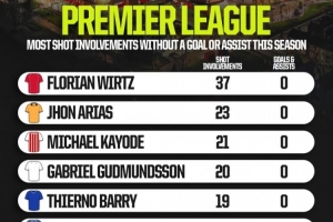 ■以下是英超本賽季零進球、零助攻情況下,最多射門參與次數排名: