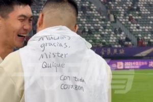 賽后,王剛披上了一件T恤,上面用西班牙語寫上了:“衷心感謝您,塞蒂恩主教練!”