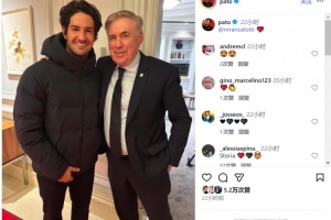 帕托社媒曬出與現(xiàn)任巴西主帥安切洛蒂的合照,并@安切洛蒂,帕托效力米蘭期間曾在安切洛蒂麾下踢球。