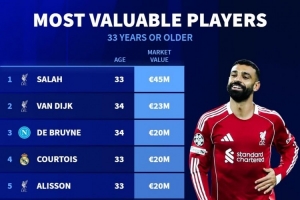 體育資訊12月7日訊 德國轉(zhuǎn)會(huì)市場(chǎng)統(tǒng)計(jì)了年齡33+球員的身價(jià),并列出榜單,薩拉赫4500萬歐居首,梅西1800萬歐第七。